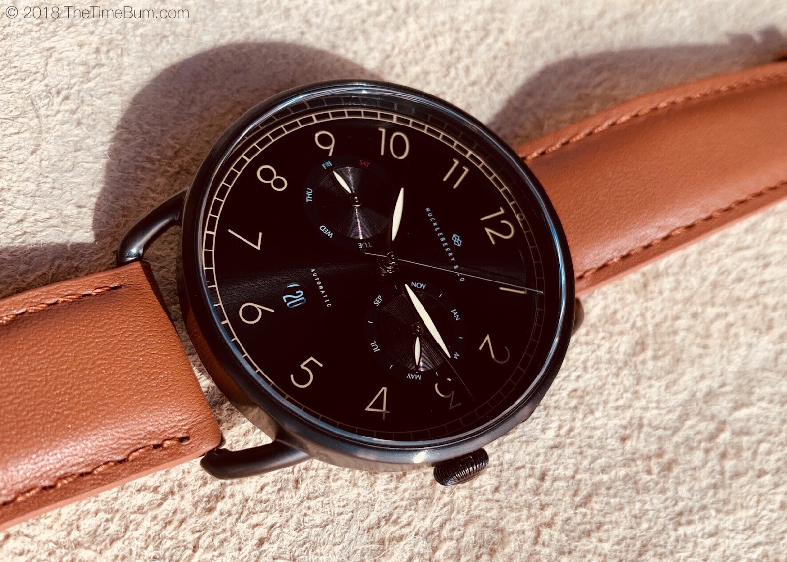 The Bakewell blue and silver sell for $800 AUD, or about $569 USD. The Black Edition is $850 AUD or about $604 USD. This is in the same range as the similarly configured, $875 AUD Melbourne Portsea Calendar I reviewed here; however, the Melbourne's impeccable finishing and multi-layer ceramic dial make it easy to justify its cost in a way the Bakewell's poor lug attachment cannot. Huckleberry & Co. has cooked up an appealing design with this watch, especially the Black Edition, but for that money, they really need to raise their game. For more information visit huckleberryandco.com.