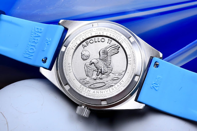 As we flip the watch over, we are greeted by a fabulous eagle touching down on the moon—just like in the moon landing fairy tales. Or perhaps it’s a literal representation of the “Eagle” lander that landed on the moon with Apollo 11. Probably the second one. It’s quite well finished, with “Apollo 11” text on the graphic itself and “The Eagle Has Landed,” “1969,” “2019,” and “50thAnniversary” in the ring around it. And around that is even more, smaller text, telling you everything you need to know, including that the watches are assembled in France, just like the original. Based on the Kickstarter, this caseback isn’t even an option, which is a damn shame, as it’s lovely. Instead, you’ll not have an avian moonscape, but a simple etched image of either a plane or a moon lander.