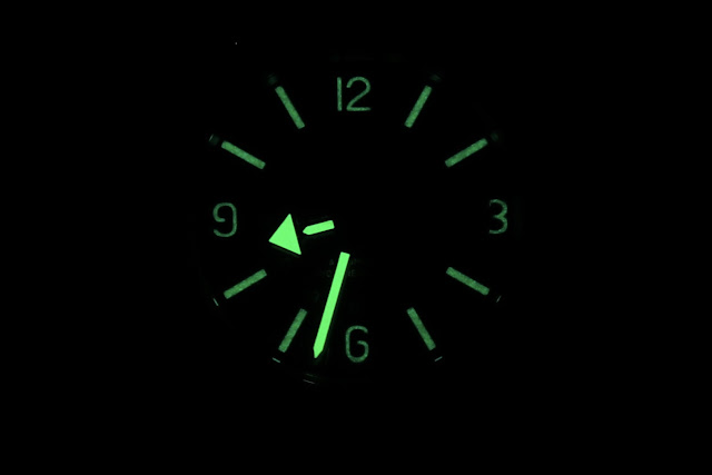 A high gloss dauphine seconds hand adds much needed pop under the crystal and contrasts with the restrained look of the hour (a gargantuan, stumpy arrow) and minute (straight, unwavering, like the path of Cupid’s arrow). The hands and hour markers all feature the same C7 Super-LumiNova. I base my assessment of lume quality on three things: charging, brightness, and evenness. The Skindiver is adequate in its brightness and charging but falls just shy of that on evenness. As you can see below, the hands shine quite a bit brighter than the indices, and the latter are somewhat mottled. I will concede that if charging and brightness are on point, evenness is of tertiary importance, and that’s true here with lume that allows for full legibility in the dark.